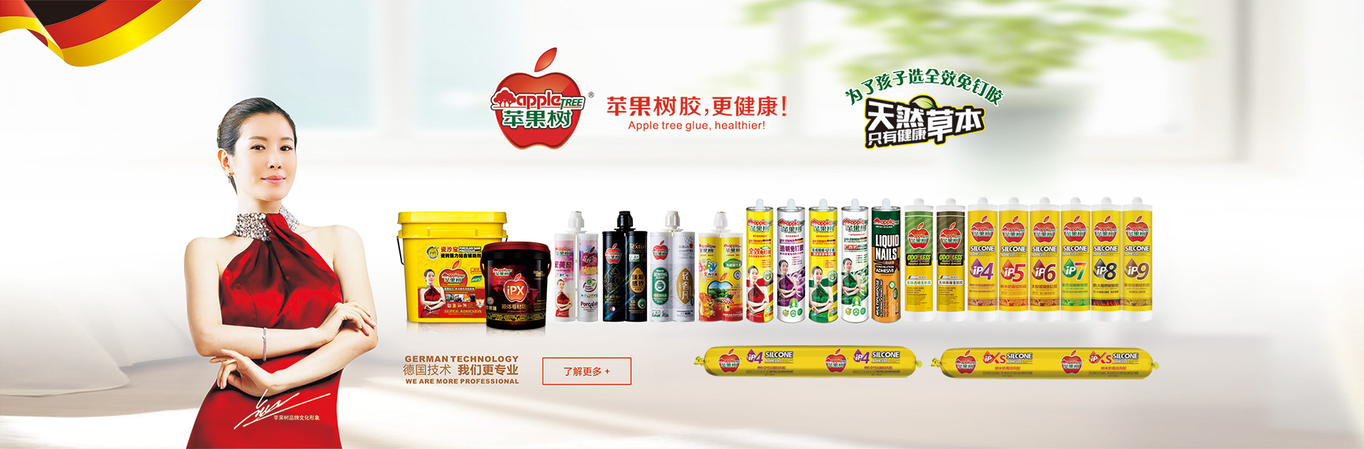 蘋果樹公司,座落于中國最具經濟活力的建材之鄉廣東順德。公司主要從事全效免釘膠、透明免釘膠、戶外免釘膠、液體釘、美縫劑、防霉膠、瓷磚粘結劑、瓷磚背膠、硅酮結構膠、密封膠、MS膠、智能特種膠、集成墻板專用膠、廣告字快速安裝膠、高分子液體卷材防水等高強度建筑結構膠的研發、生產和銷售。產量與市場占有率均居行業前列。